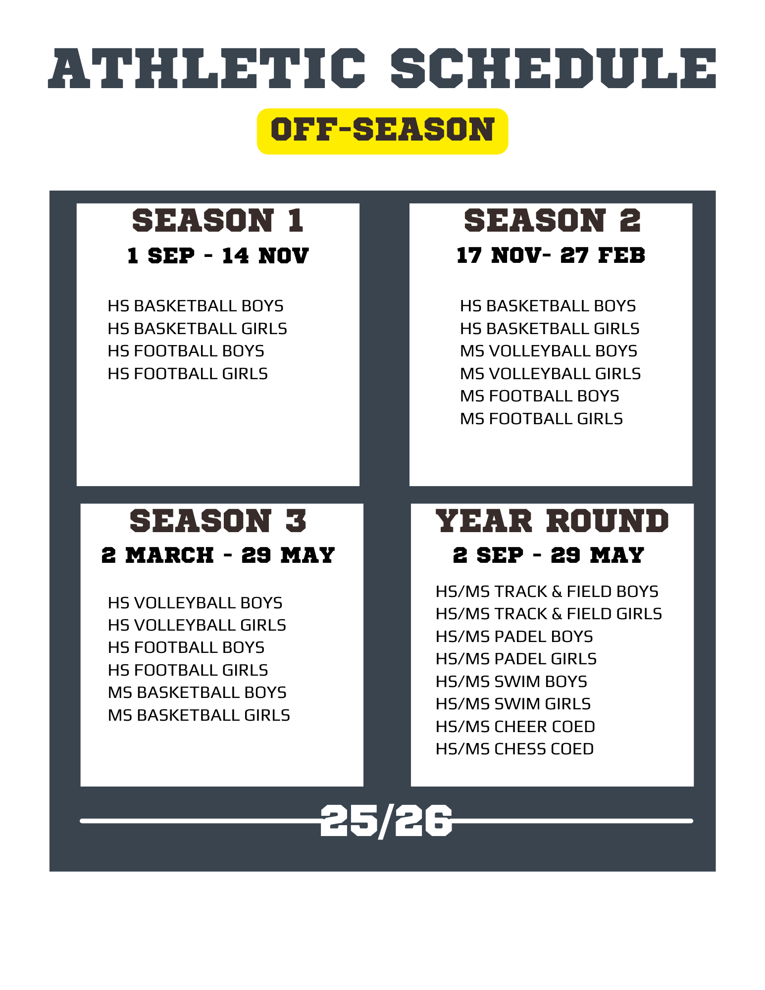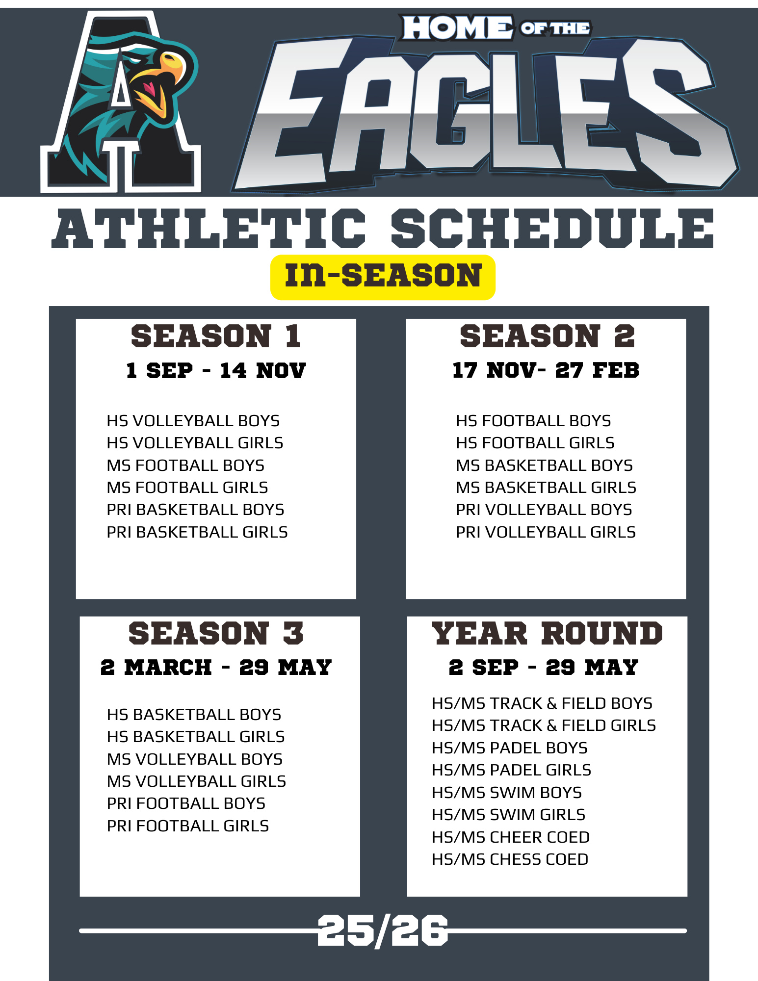 Please be aware that game and tournament dates may change due to external circumstances. We will let you know of any updates as they come up.